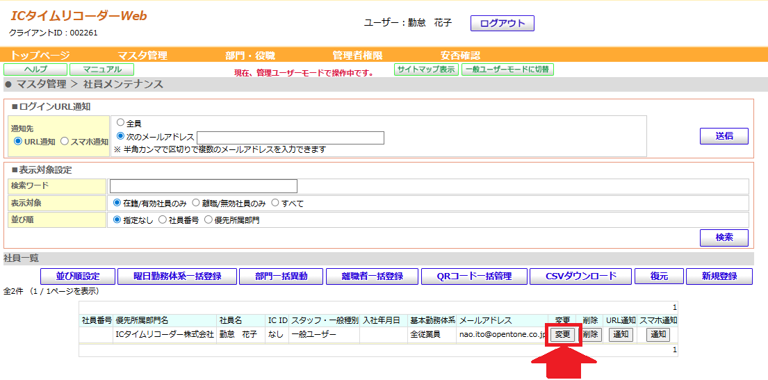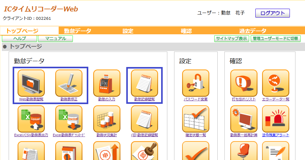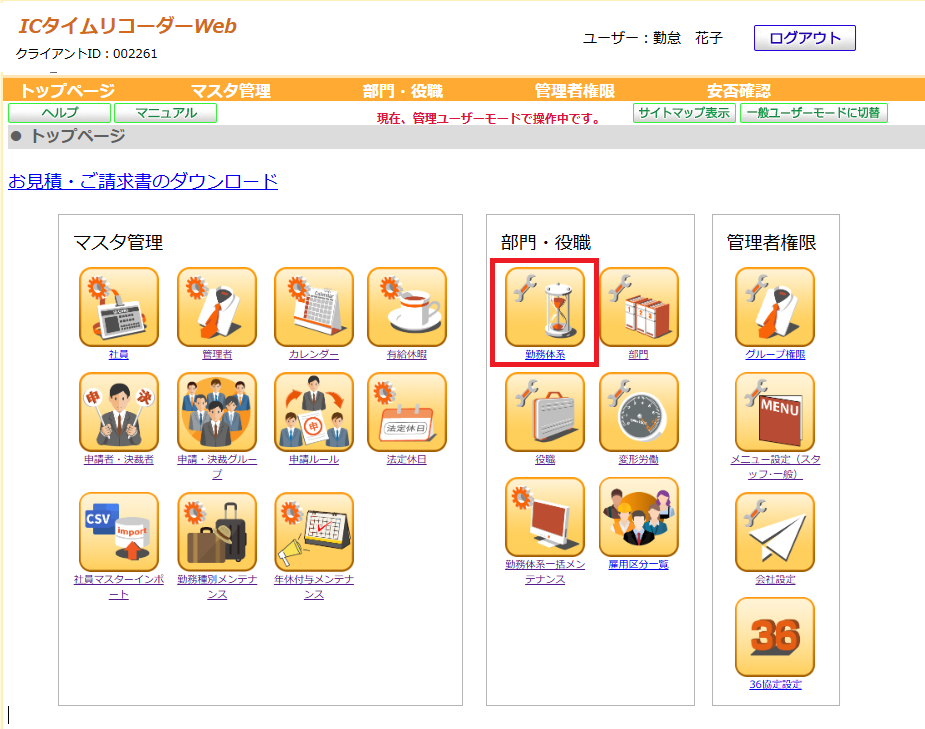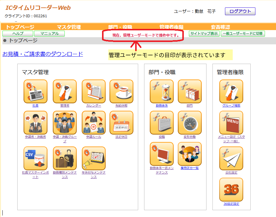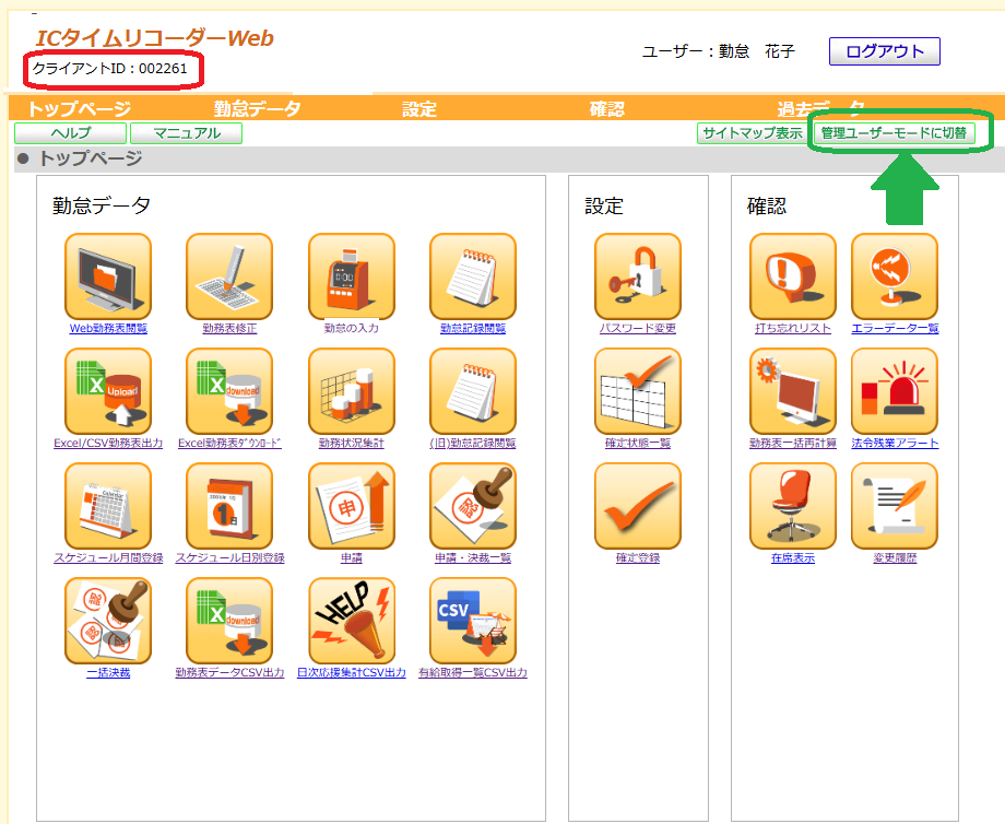 右上緑色の【管理ユーザーモードに切替】ボタンで 【管理ユーザーモード】 に切り替えます。