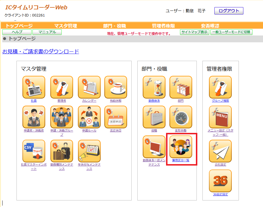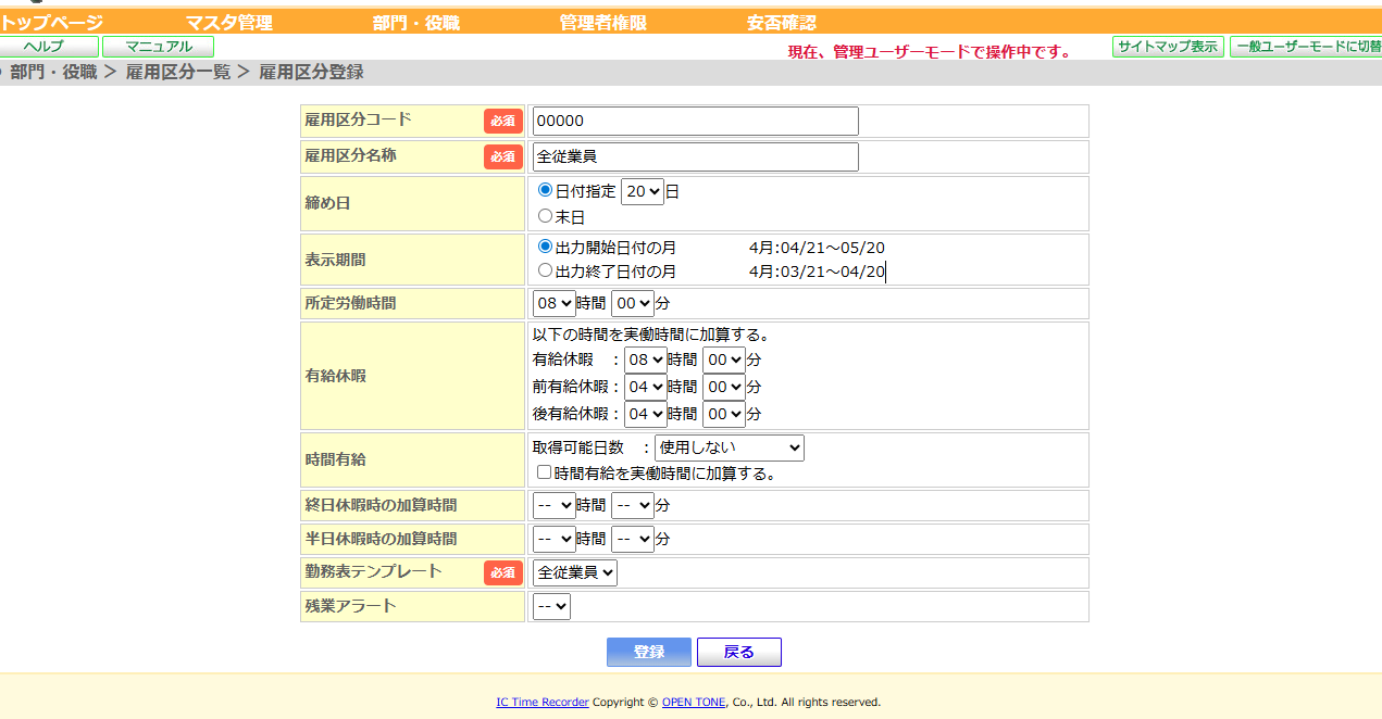 管理ユーザーモードメニュー:部門・役職>雇用区分一覧 を開きます。
