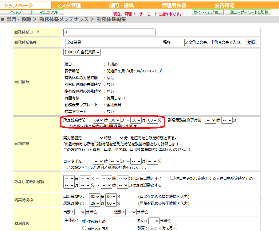 勤務のパターン(勤務体系)や従業員の登録を行うなど、