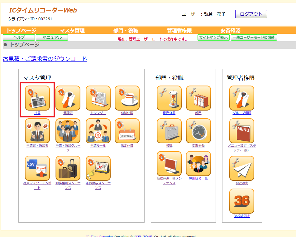 マスタ管理やメンテナンスで使用するのが管理ユーザーモード です。