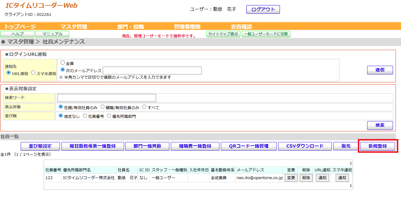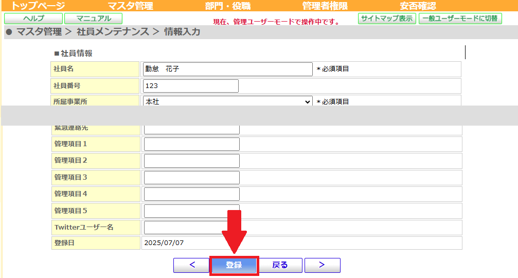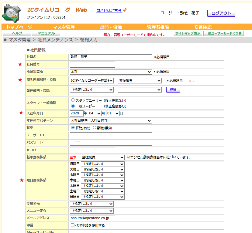 社員名、社員番号、優先所属部門(自社名選択)などを入力し、登録します。