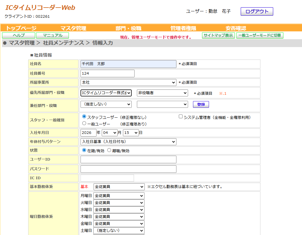 (必須項目ではありませんが、給与システムとの連携や有給自動付与機能を使用する場合に必要となる情報です。) - 曜日勤務体系が「(指定しない)」となっています。これは”所定休日”を意味するため、