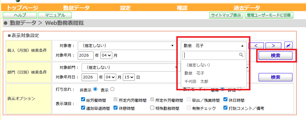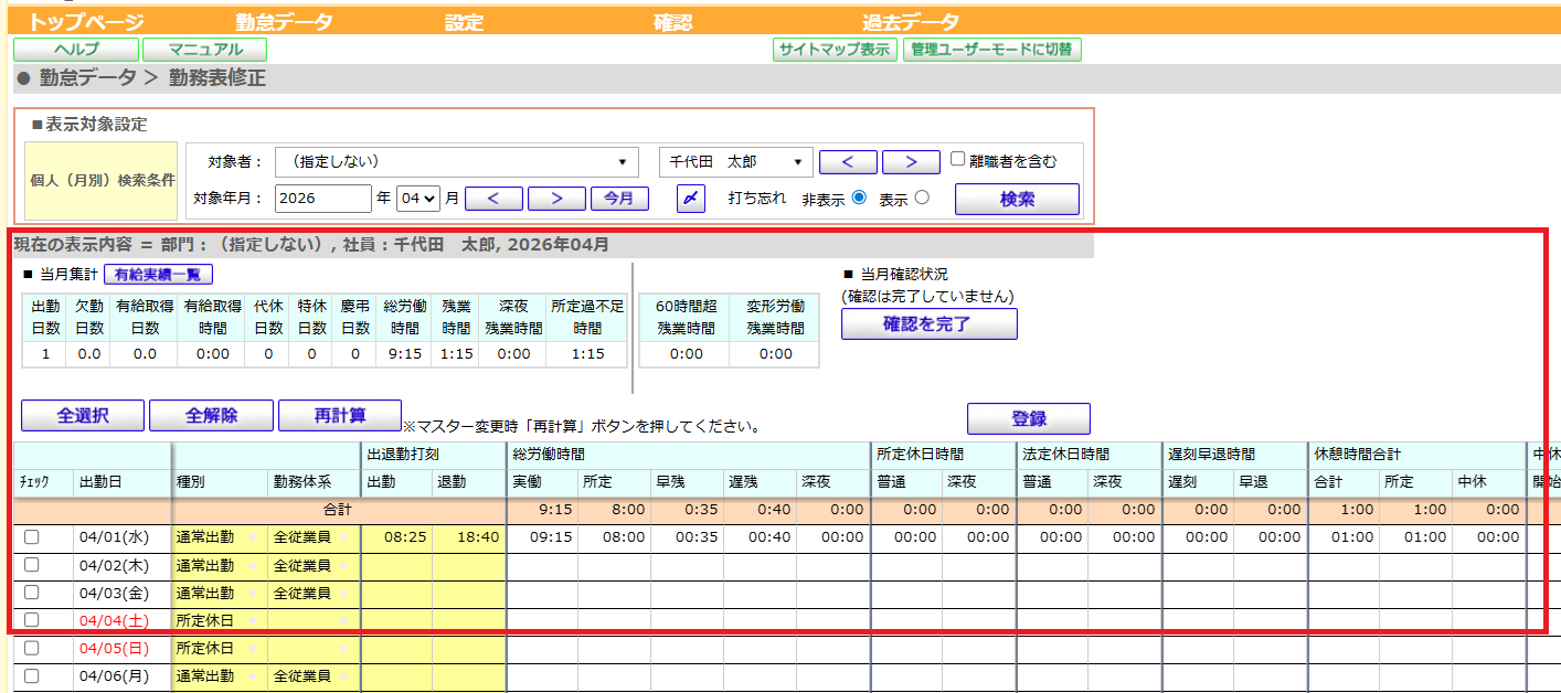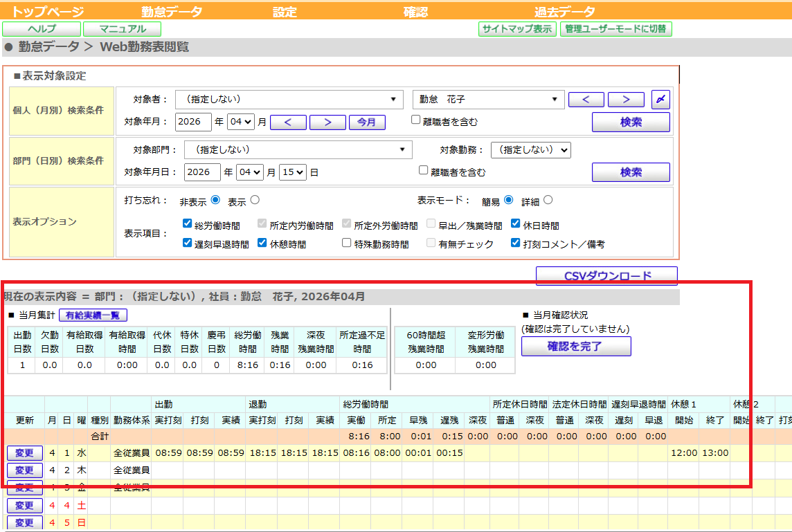 出勤と退勤の打刻が記録され、時間や日数が集計されていることを確認します。