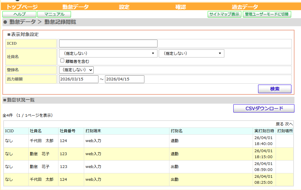 日付、登録名「出勤」「退勤」で絞り込んで確認することが可能です。