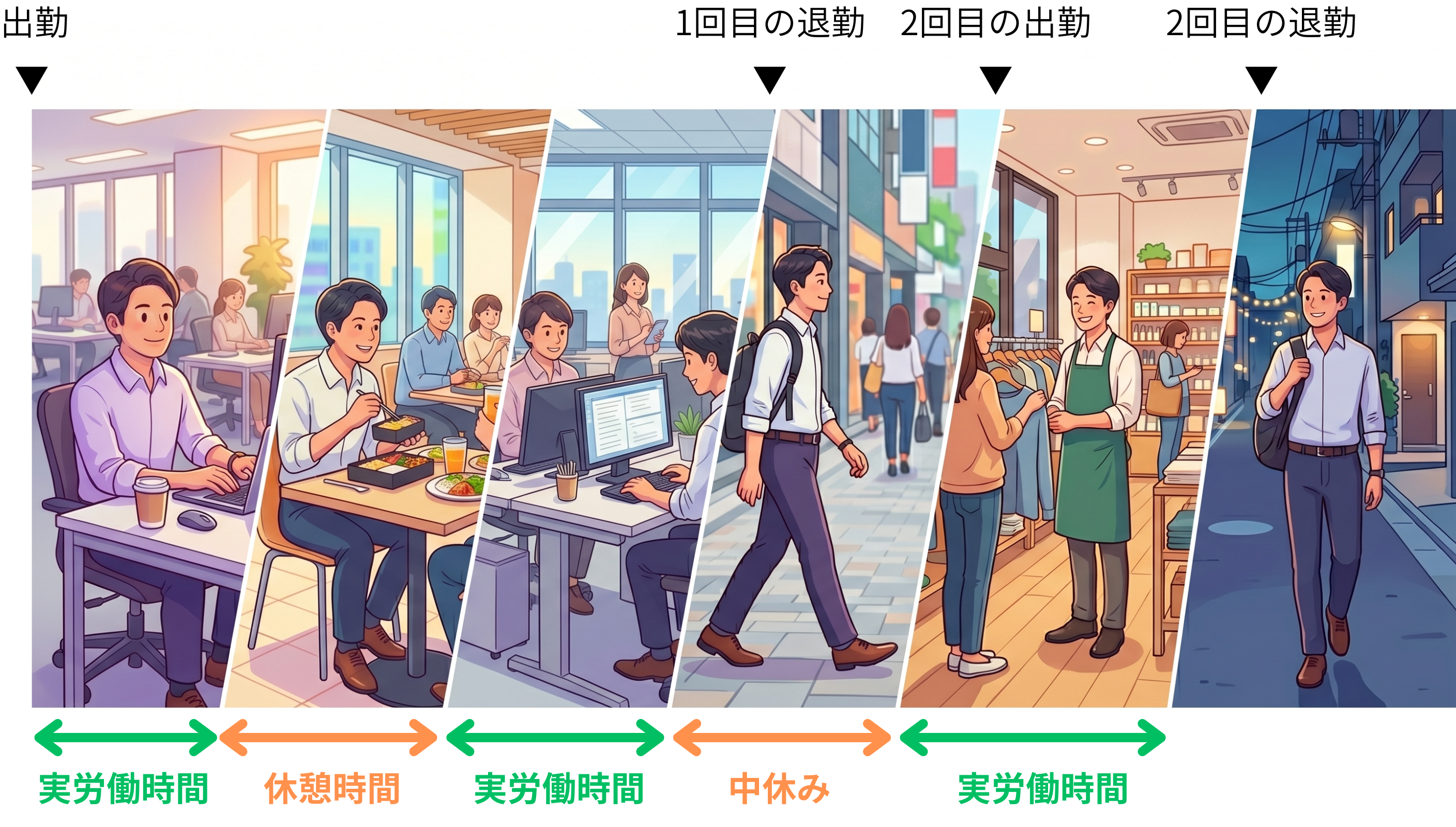 1日の中で出勤/退勤を2回、3回と行うような勤務のことを差します。