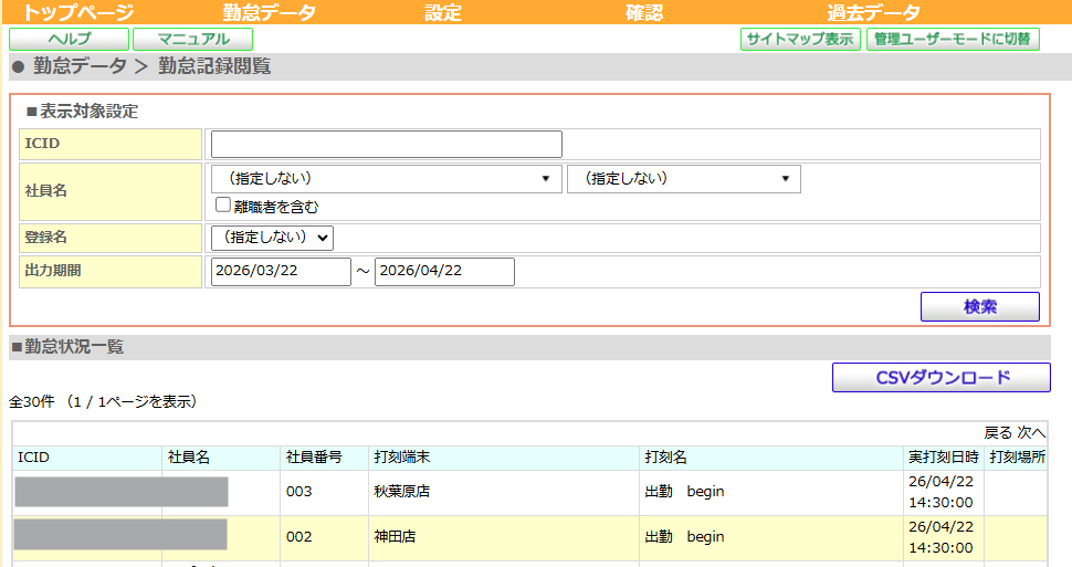 勤怠記録閲覧にて打刻端末の名称と日次を確認、CSVダウンロードすることができます。