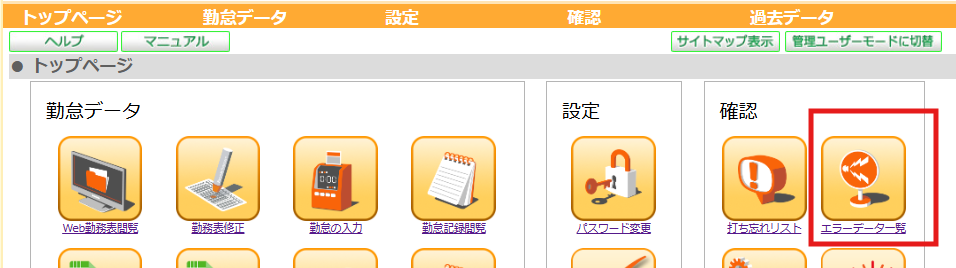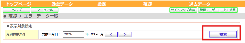 ▼「ICタイムリコーダーWeb>一般ユーザーモード> 確認 > エラーデータ一覧>該当月で検索」